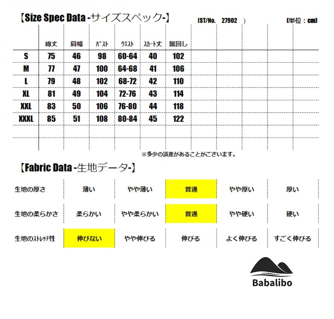 【XXXL】:総丈85 肩幅51 バスト108 ウエスト80-84 スカート丈45 蹴回し122