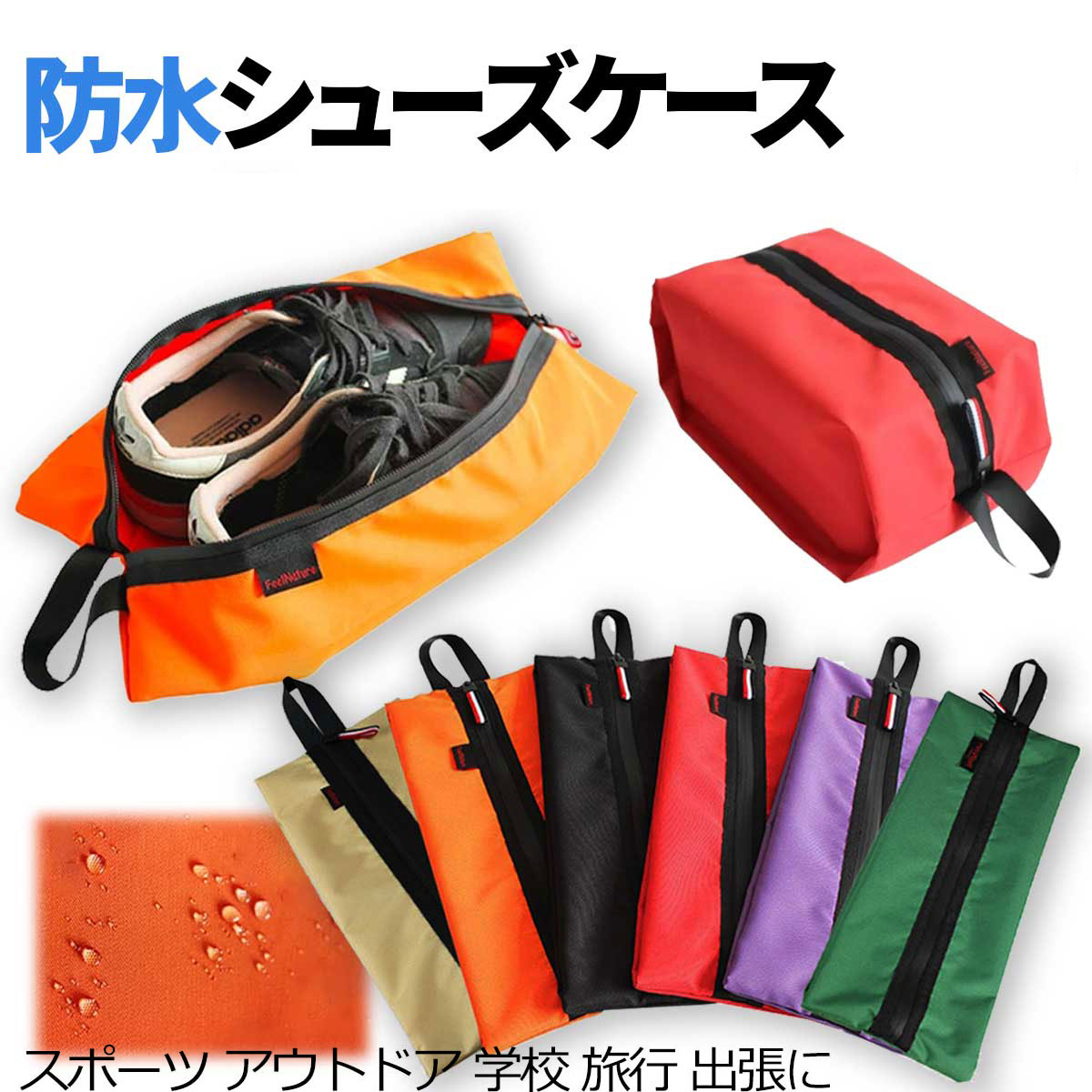 シューズケース 防水 コンパクトに折りたためる ファスナー 5色 ブラック パープル オレンジ レッド ベージュ スニーカー 折りたたみ コンパクト 水筒バッグ サッカー