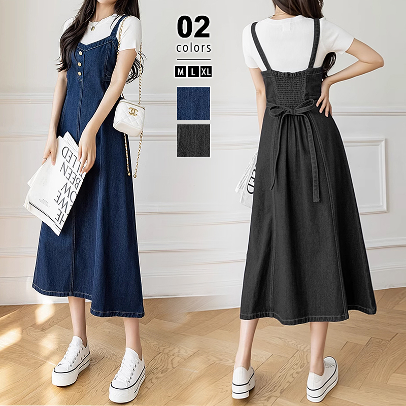 キャミ ワンピース デニム レディース ワンピース ジャンパースカート キャミワンピ ロングワンピース レディース デニムワンピース キャミワンピース ノースリーブ オールインワン ミモレ ワンピ リボン デニムキャミ ジャンスカ 金ボタン 重ね着 春 夏 秋